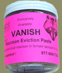 VANISH raccoon eviction paste causes a biological instinctual reaction in female raccoon to flee an area where she is denning, many times taking her young with her. VANISH is a naturally occurring glandular based product, and it is no more a repellent (nor should it be classed as such) than coyote urine to a coyote !